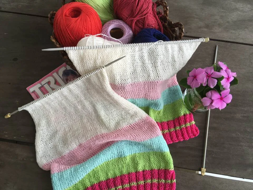 Obs: Com o fio rosa pink tricotei por 6cm com uma listrinha no meio de verde harmonia, verde harmonia 5cm, verde piscina 5cm, rosa claro 7cm e com o fio Charme tricotei o restante da blusinha.