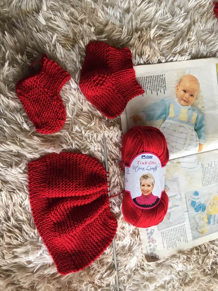 Montar 32 pontos nas agulhas numero 4 com o fio branco e tricotar em pontos cordão de tricô