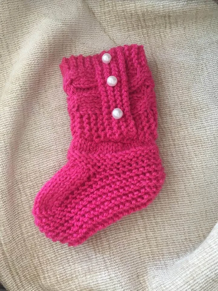 Montar 20 pontos nas agulhas numero 5 e tricotar 4 cordões de tricô, em seguida 5 pontos cordão de tricô, 6 pontos meia para a trança, 2 pontos tricô, 6 pontos para a trança e 5 pontos cordão de tricô por 17cm, mais 4 cordões de tricô. Remate. Costurar as duas partes e montar a botinha.