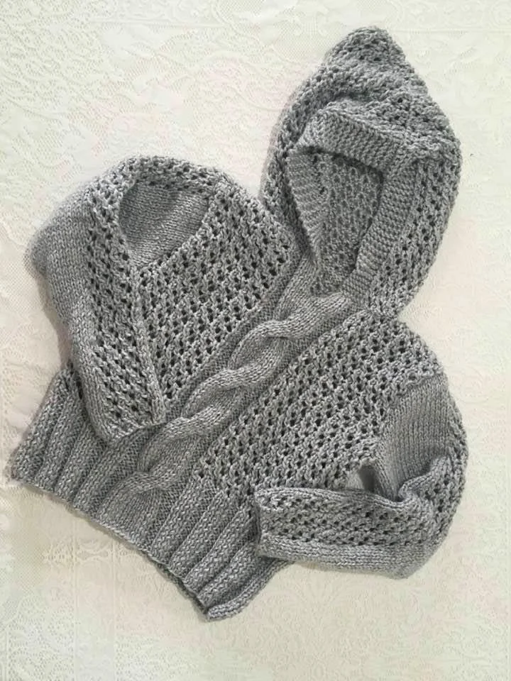 Costure os ombros e levante com as agulhas circulares numero 7, 76 pontos ao redor do decote, tricotar 6 pontos cordão de tricô (ida e volta nas agulhas em pontos meia) nas bordas e o restantes dos pontos em pontos fantasia. A 33cm remate os pontos e costure a parte de cima do capuz.
