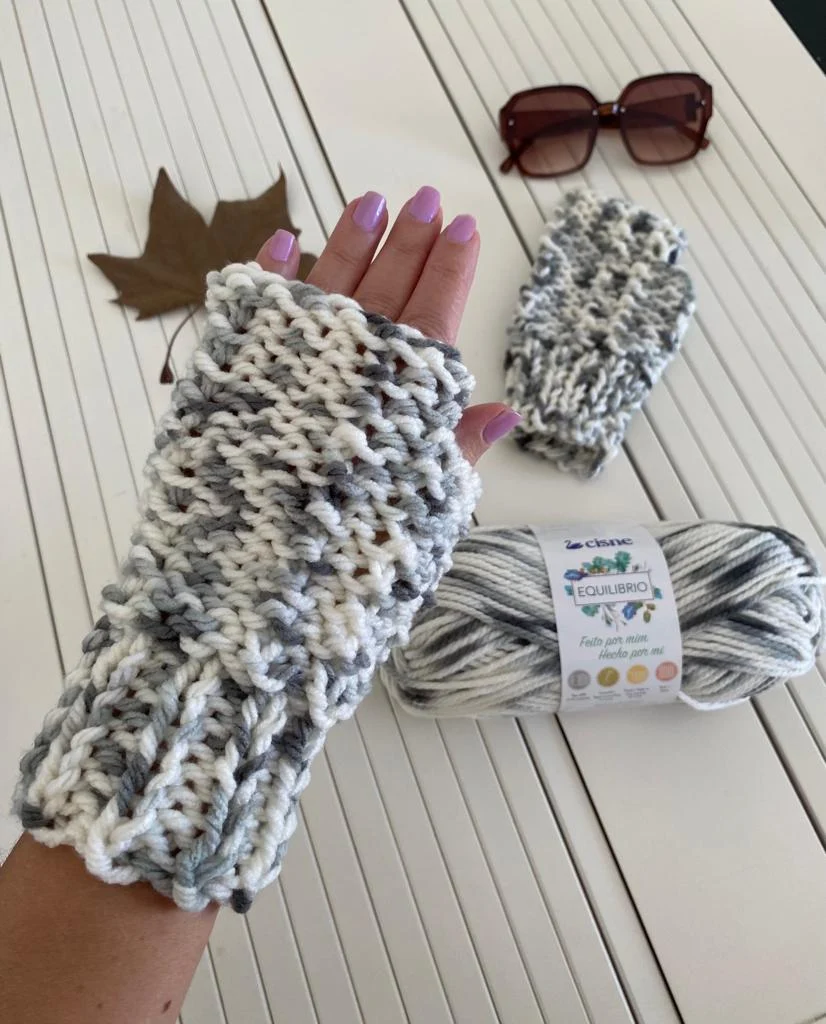 - Montar 20 pontos nas agulhas número 9 com o fio Equilibrio e tricotar em 1 ponto meia e 1 ponto tricô por 9 carreiras (7cm);