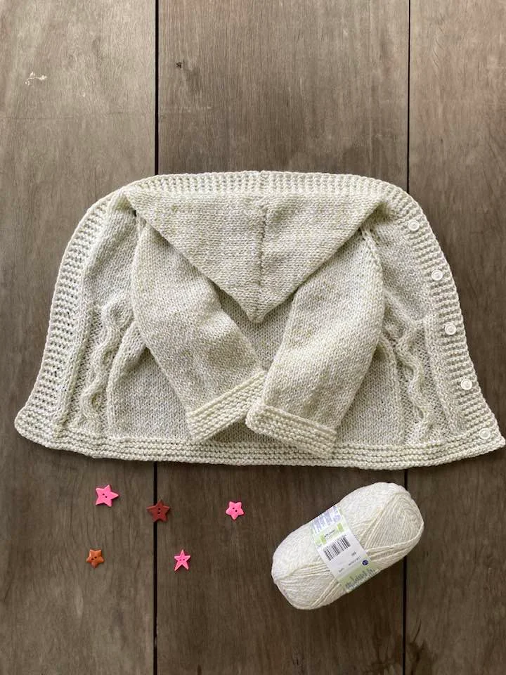 - 1º carreira: 7 pontos em cordão de tricô para a barrinha da frente, 5 pontos meia para a parte da frente, 1 laçada, 2 ponto meia, 1 laçada, 8 pontos meia para a manga, 1 laçada, 2 ponto meia, 1 laçada, 20 pontos meia para a parte de trás, 1 laçada, 2 ponto meia, 1 laçada, 8 pontos meia para a manga, 1 laçada, 2 ponto meia, 1 laçada, 5 pontos meia para a parte da frente e 7 pontos cordão de tricô para a barrinha da frente.