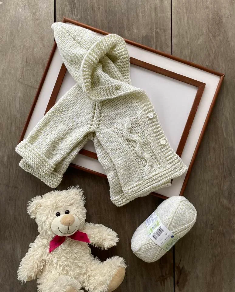 - Para as mangas, com a agulha número 6.5 coloque os pontos que estavam a espera e tricote em pontos meia por 34 carreiras (20cm), tricotar 4 cordões de tricô.